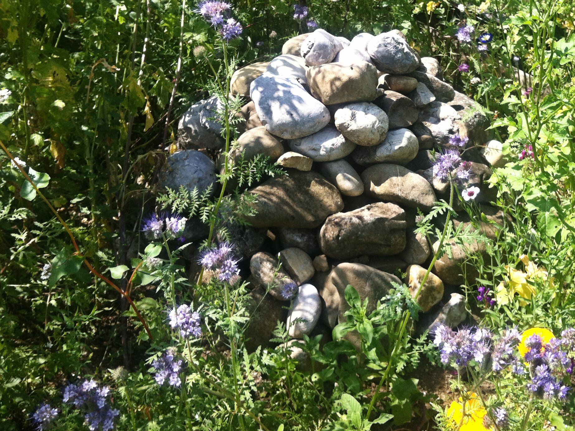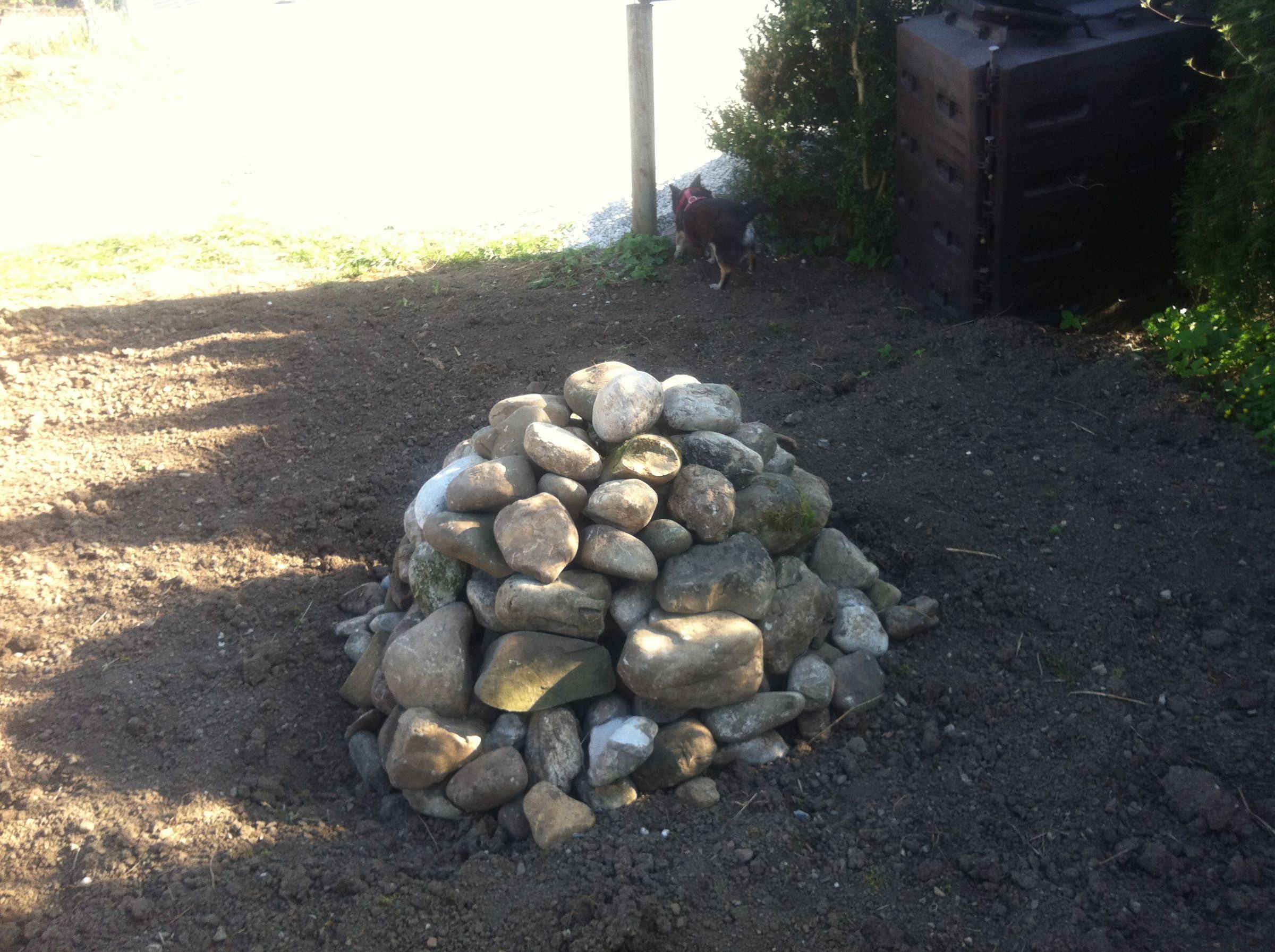 Erst mußten Anita und Peter das Gras und Unkraut mitsamt Wurzeln entfernen. Das war eine Menge Arbeit. Viele herumliegende große Steine trugen Anita und Peter zusammen, der Steinhaufen soll zu einer Wohnung für Insekten und Eidechsen werden.