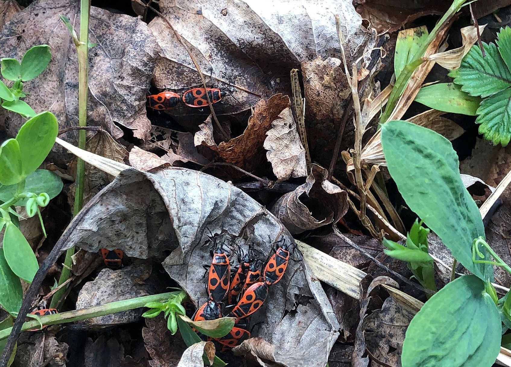 Deshalb machen wir kurz an einem geschützten Plätzchen Rast, um etwas Warmes zu trinken. Zwischen altem Laub entdecken wir Feuerwanzen beim Hochzeitstanz. Die lassen sich durch uns gar nicht stören.