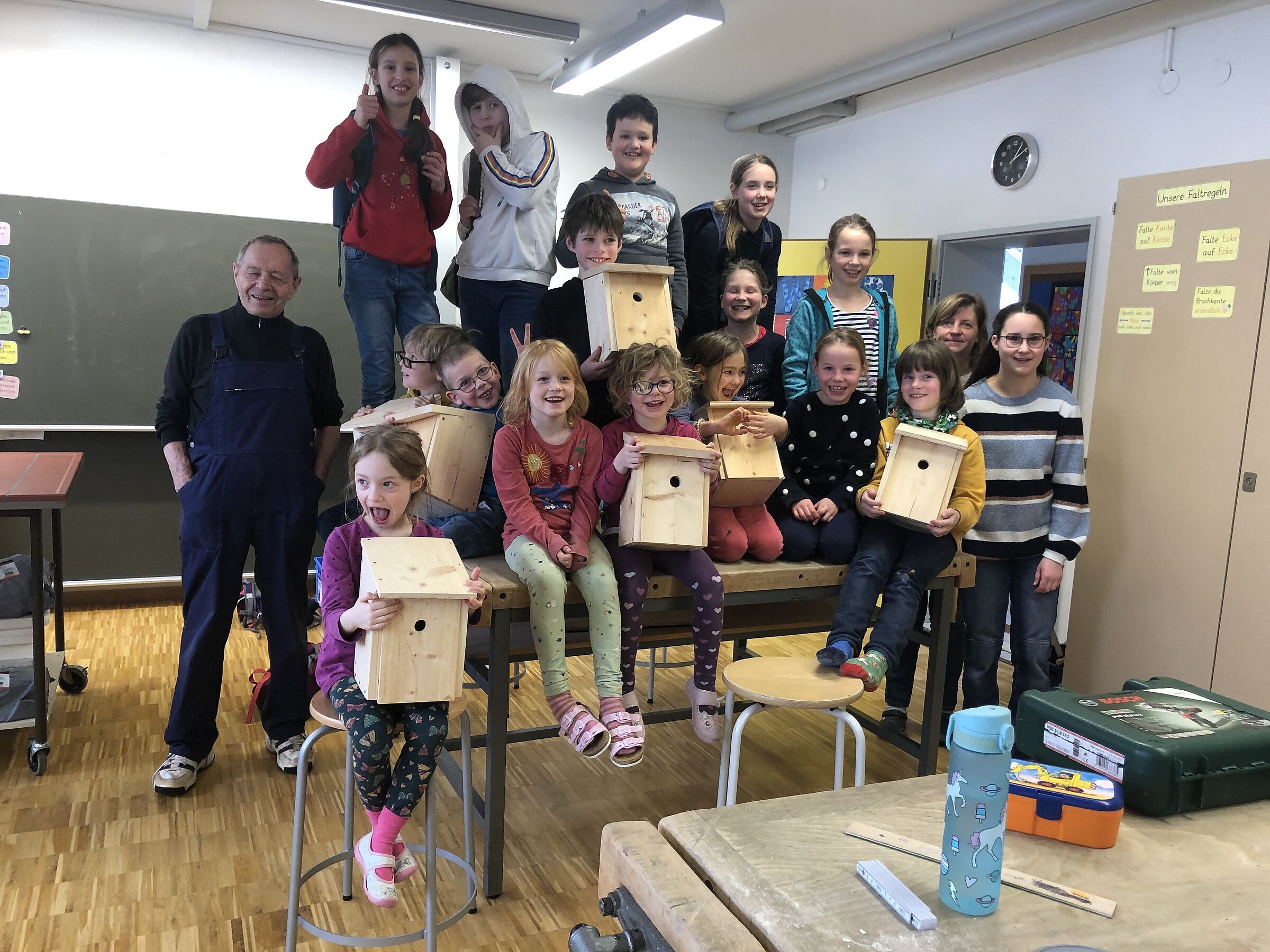 Er lobt uns, wie toll wir die Nistkästen gebaut haben und dass die Größe des Einfluglochs genau für kleine Waldvögel geeignet ist.