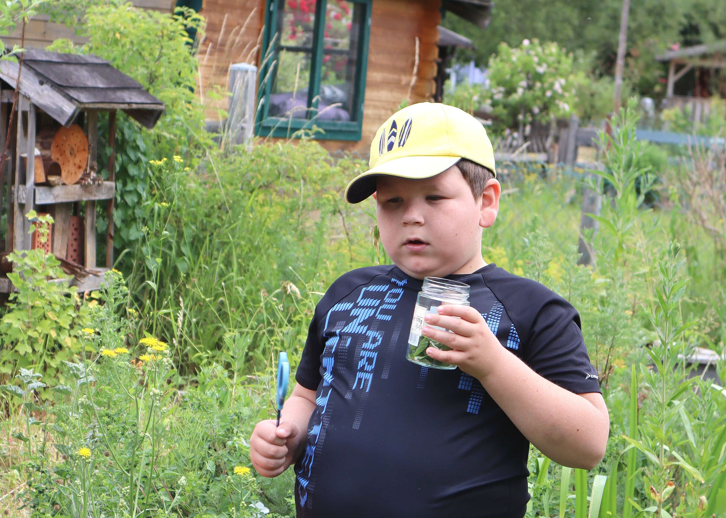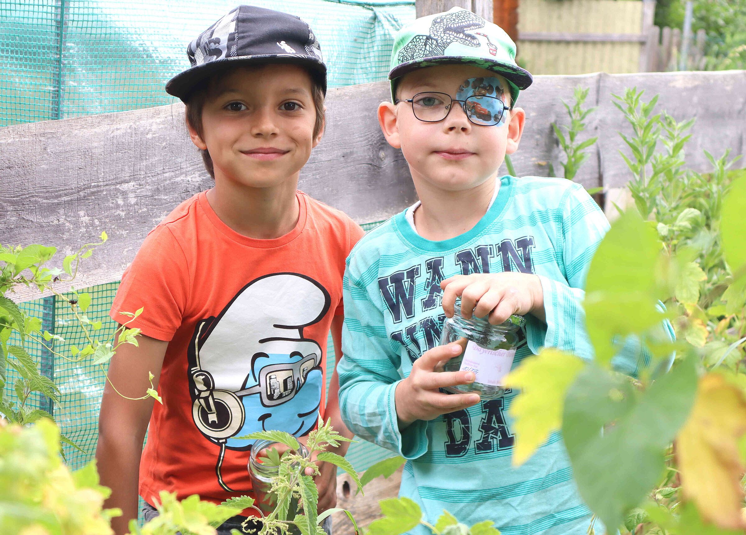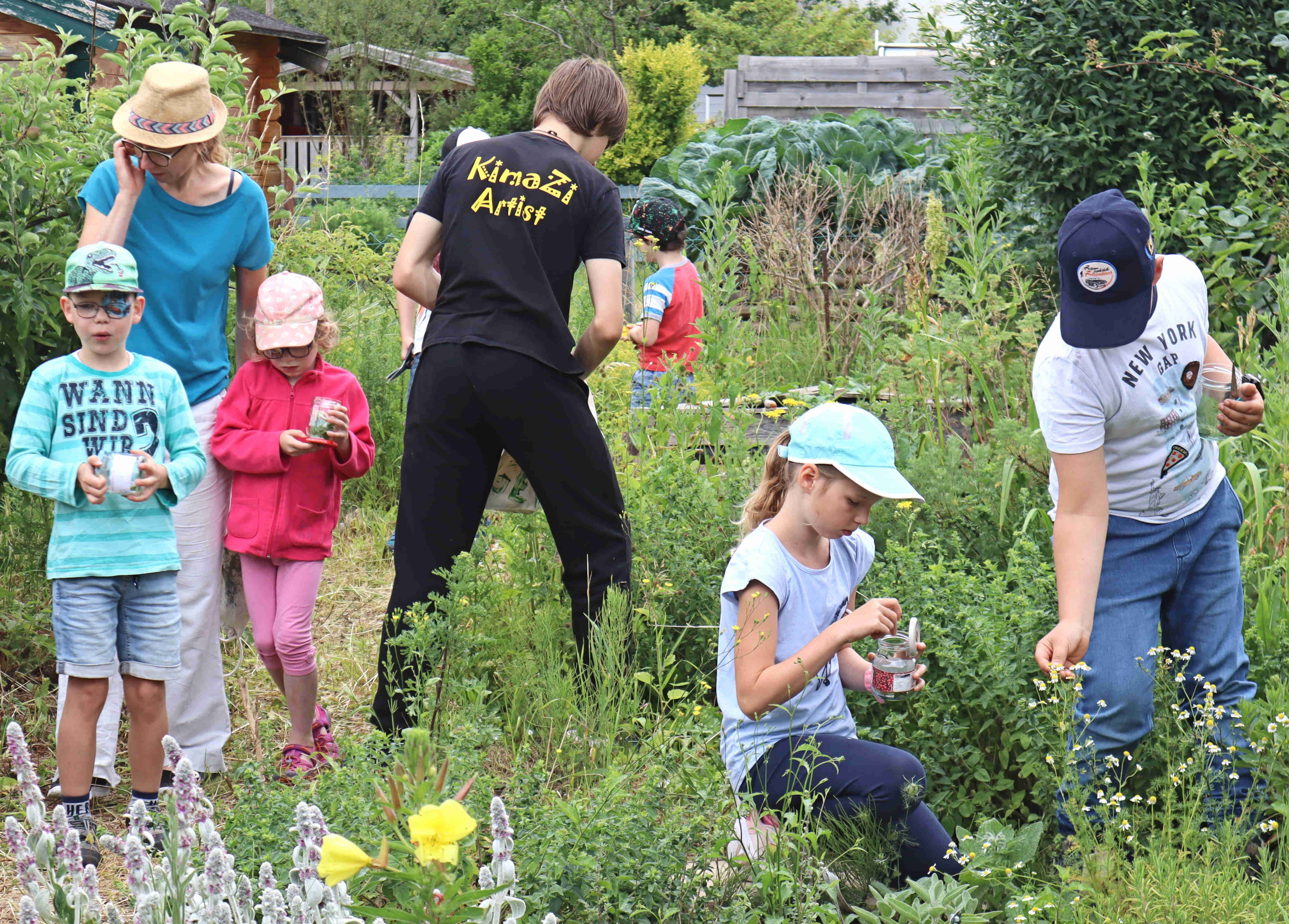 Heute treffen wir uns bei unserem Heimgarten. Wir wollen nämlich Kräutersirup herstellen und dafür werden wir Wildkräuter und andere Kräuter aus unserem Kräuterbeet sammeln. Anita zeigt uns einige Wildkräuter, die sich selbst angesiedelt haben, wie den kleinen Wiesenknopf, das Klettenlabkraut, die Brennnessel, den Waldmeister und den Frauenmantel. Auch Boretsch und Oregano blüht jedes Jahr wunderschön. Das freut auch die Bienen!