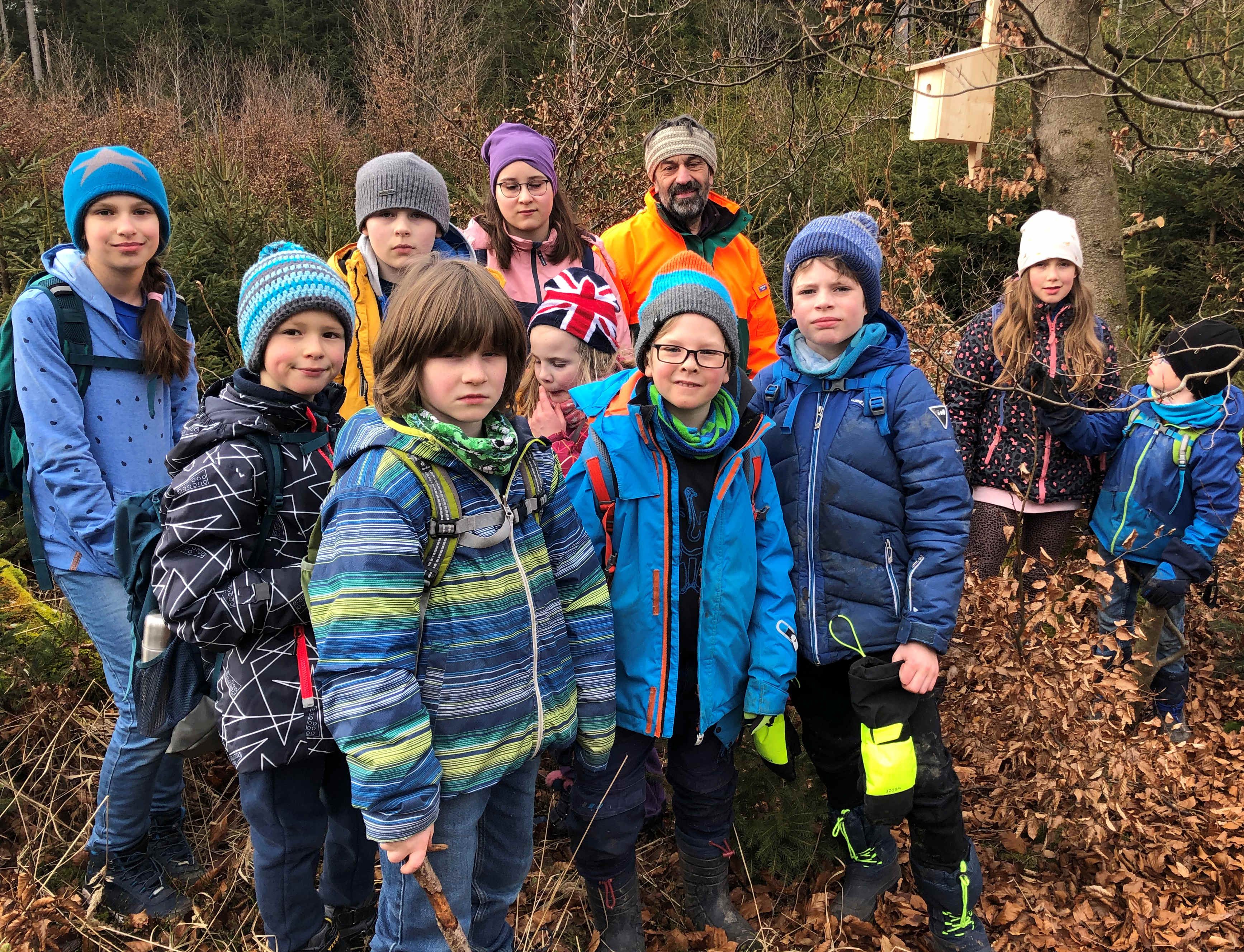 Hurra, heute dürfen wir endlich unsere selbst gebauten Nistkästen in Förster Charlys Wald aufhängen. Zum Glück hat es nicht so viel Schnee, so dass wir vom Treffpunkt am Waldanfang zu Fuß den Wald von Charly erreichen.