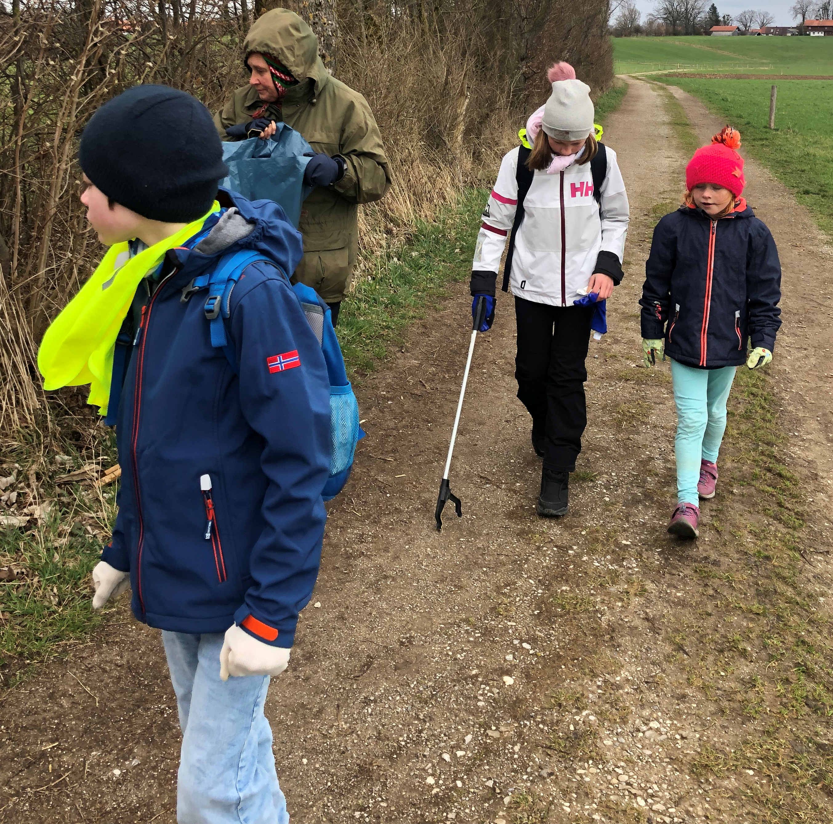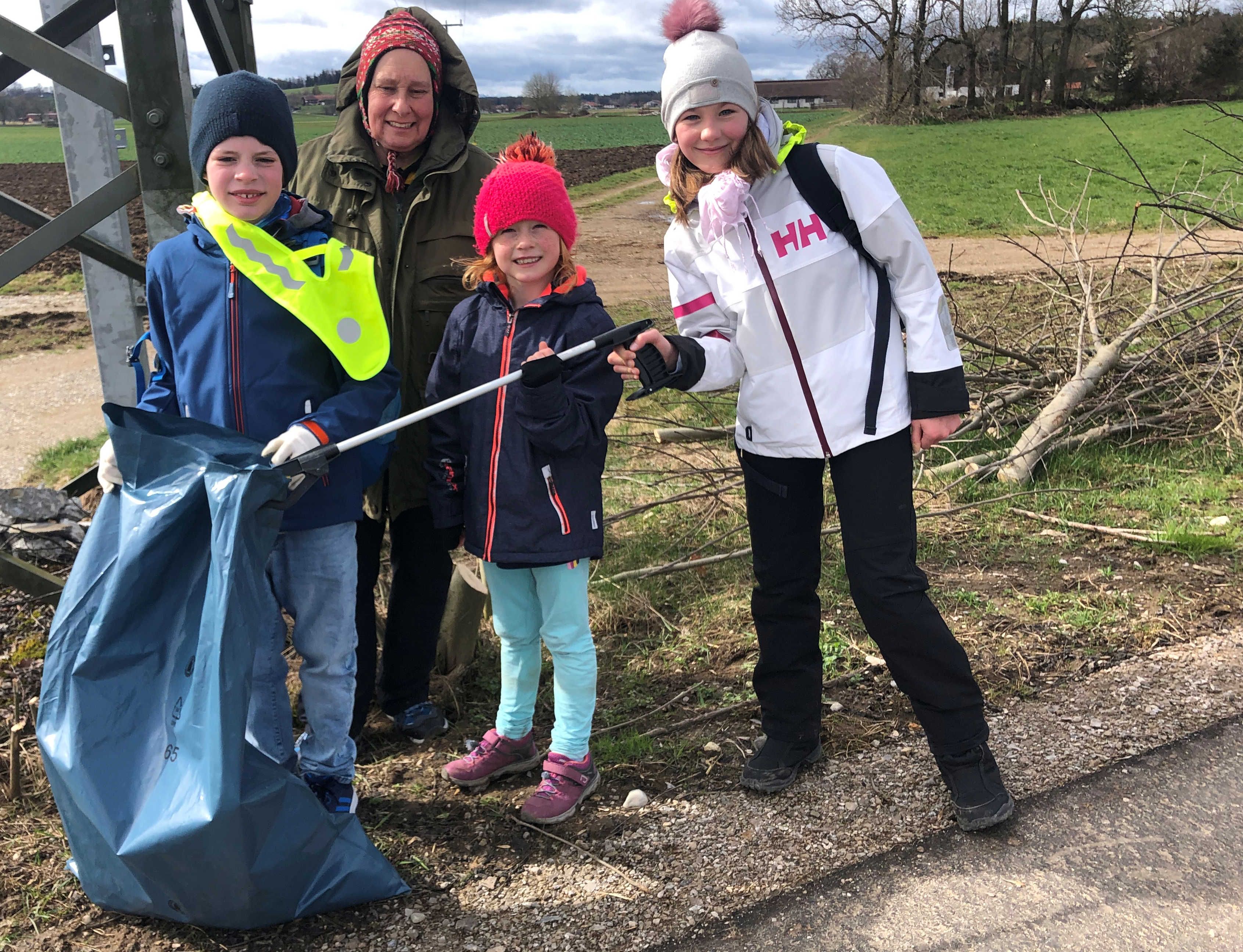 Am Waldrand finden wir ebenfalls einigen Unrat. Dafür ist die neue Straße nach Wettlkam noch sehr sauber. Deshalb können wir uns eilig auf den Heimweg machen, denn die Brotzeit der Gemeinde wartet auf uns. Die lassen wir uns dann aber schmecken. Ein Fotograph der Zeitung macht von allen fleißigen Helfern ein Foto. Vielleicht werden wir ja berühmt?