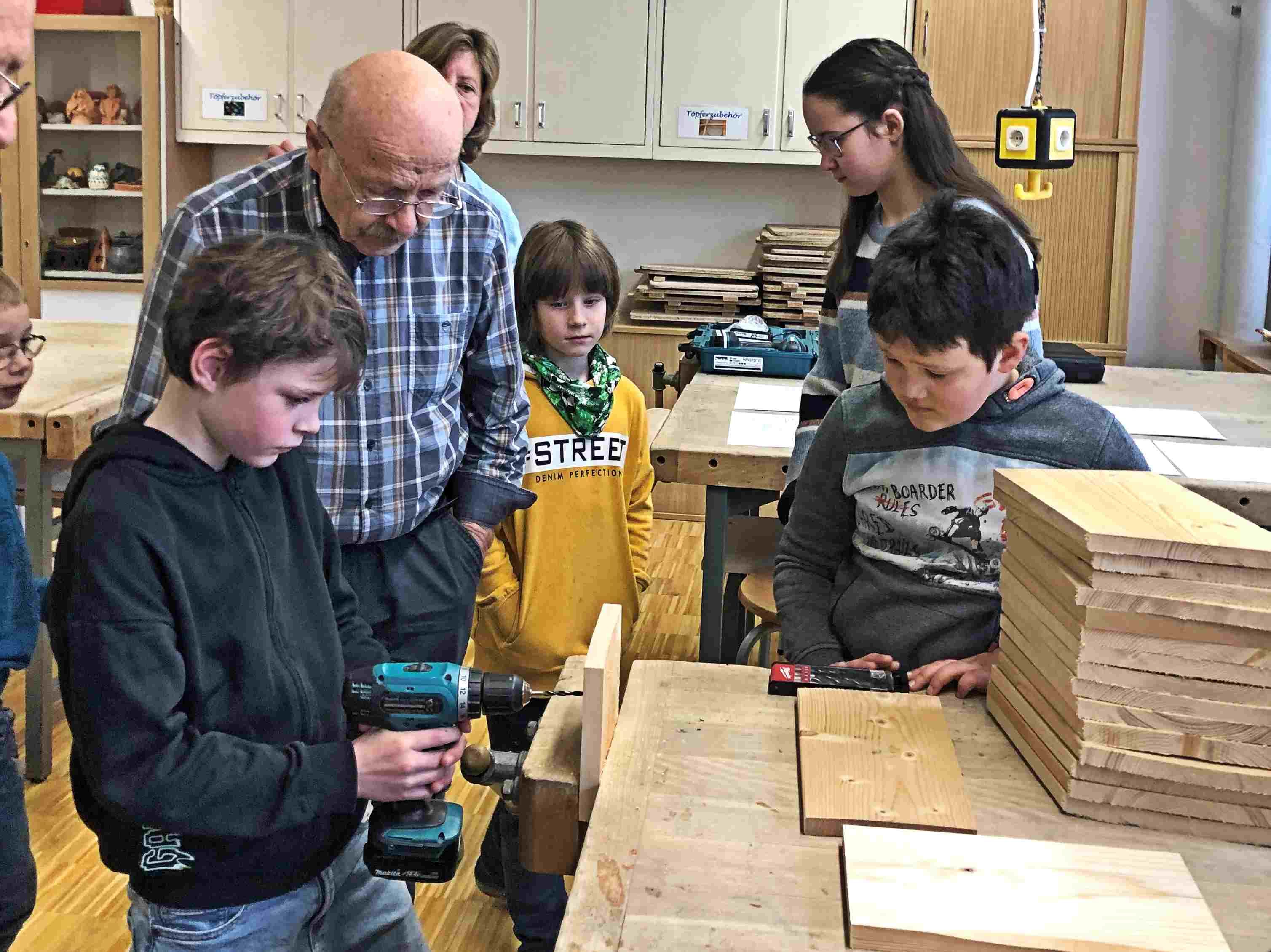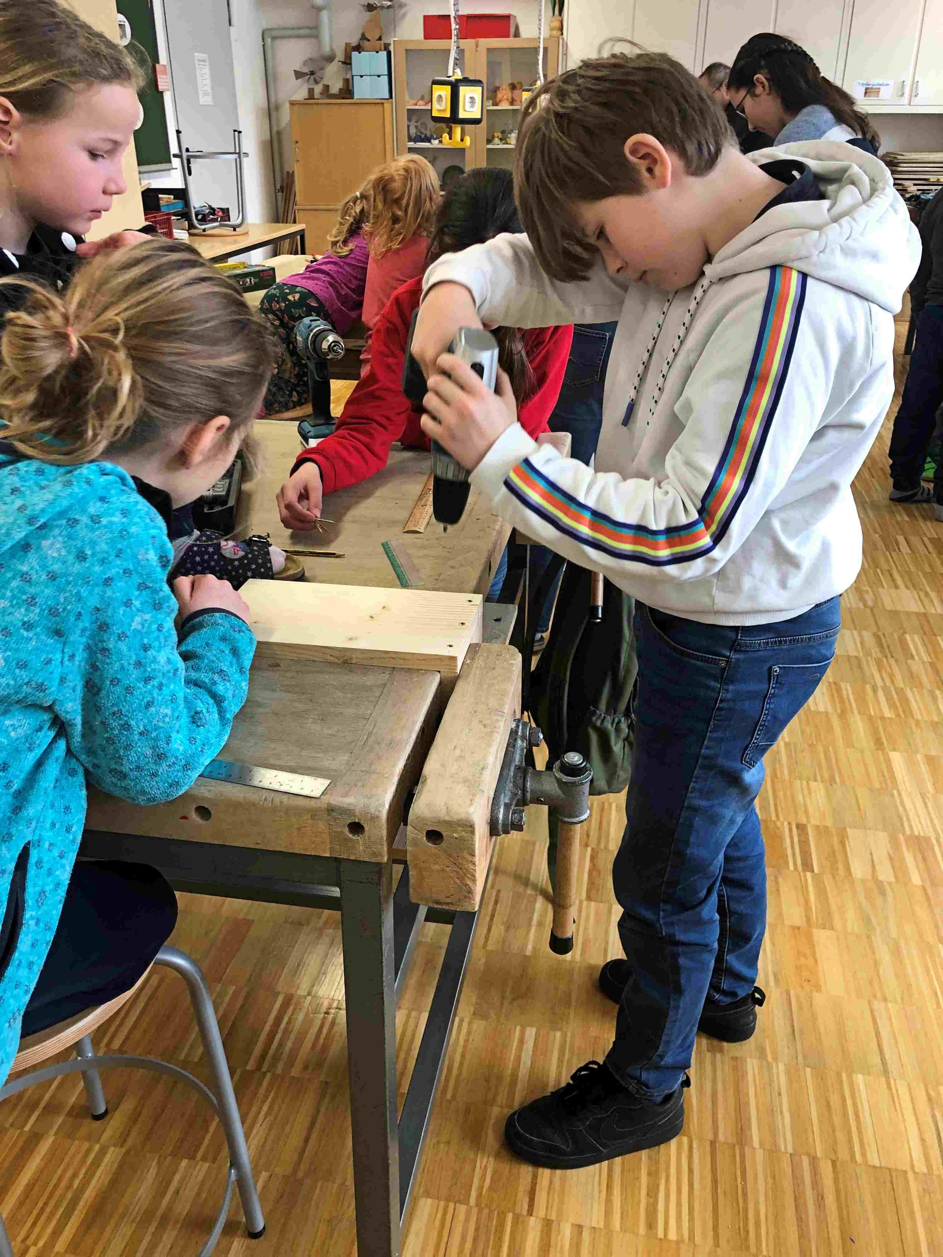Deshalb können wir gleich mit dem Bohren und Schrauben beginnen. Gut, dass wir diesmal Hilfe von Erwachsenen haben. Außer unseren Betreuerinnen unterstützen uns auch Horst und Roland.