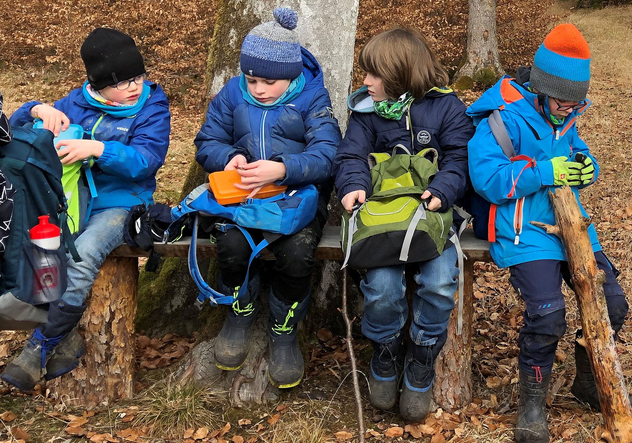 6 Nistkästen haben wir inzwischen aufgehängt. Der letzte muss noch warten, denn jetzt kommt die Sonne und wir finden eine Waldlichtung auf der eine Bank steht. An diesem schönen Ort wollen wir unsere Brotzeit machen.
