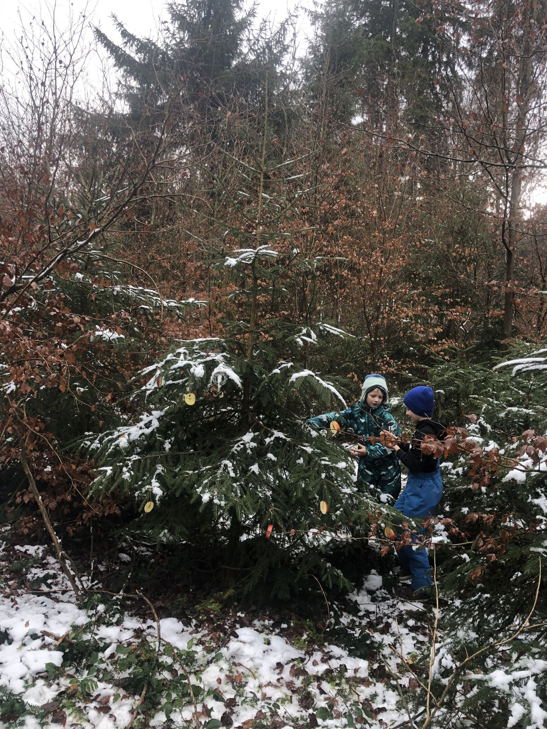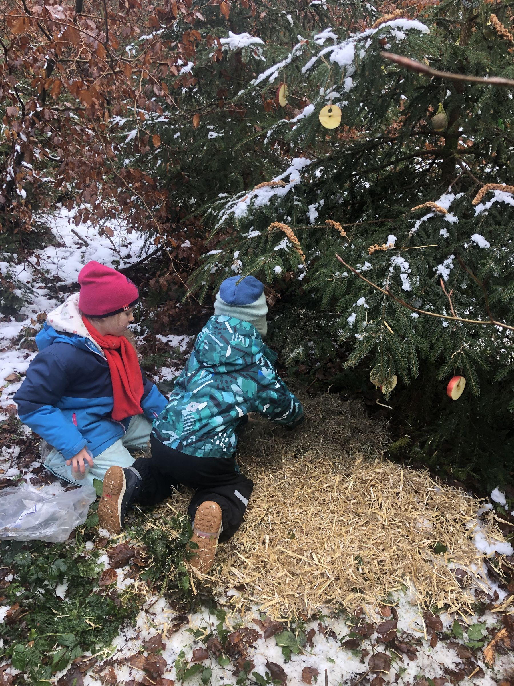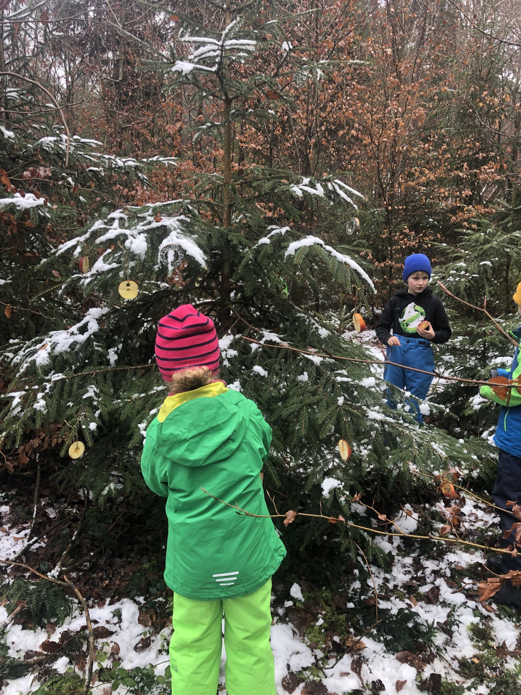 Bei wunderschönem Sonnenschein wollen wir heute den Tieren im Wald einen Weihnachtsbaum mit essbaren Dingen schmücken. Darauf haben wir uns schon so lange gefreut.