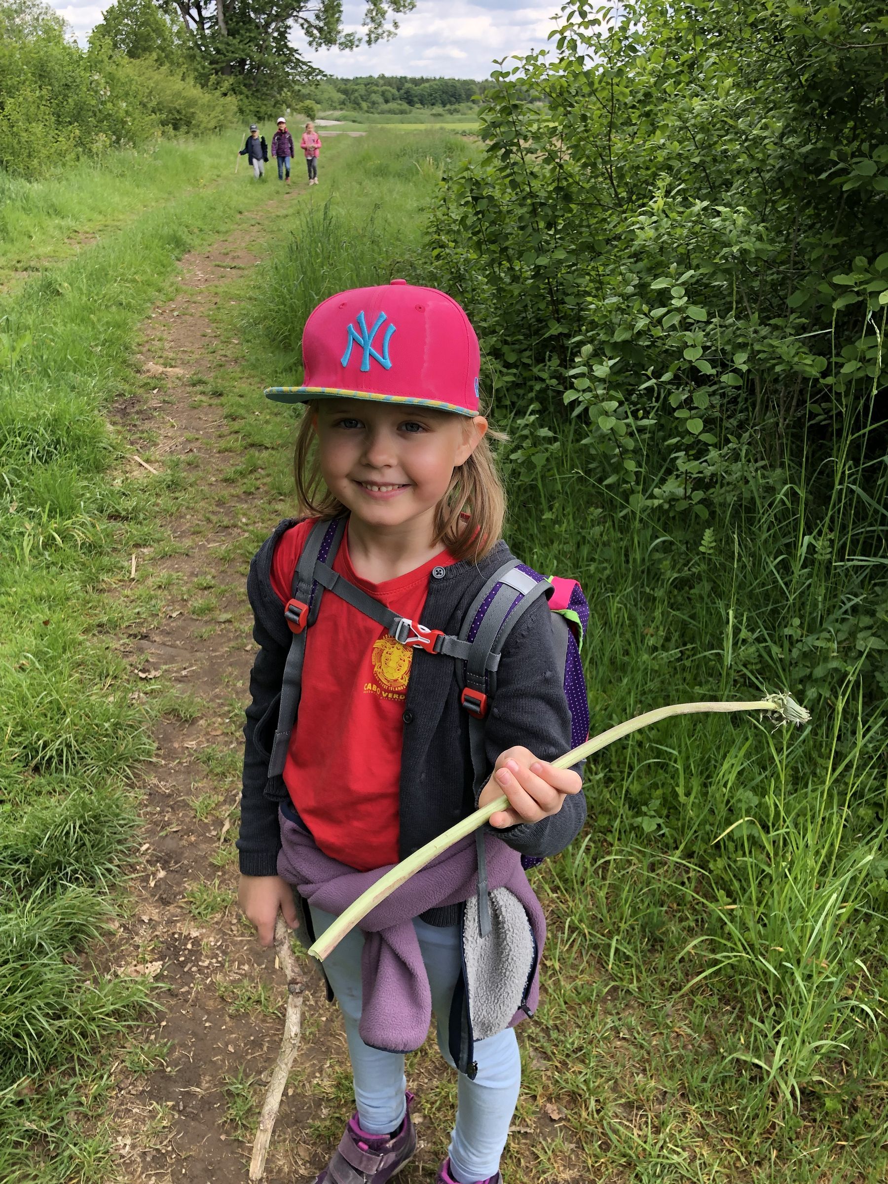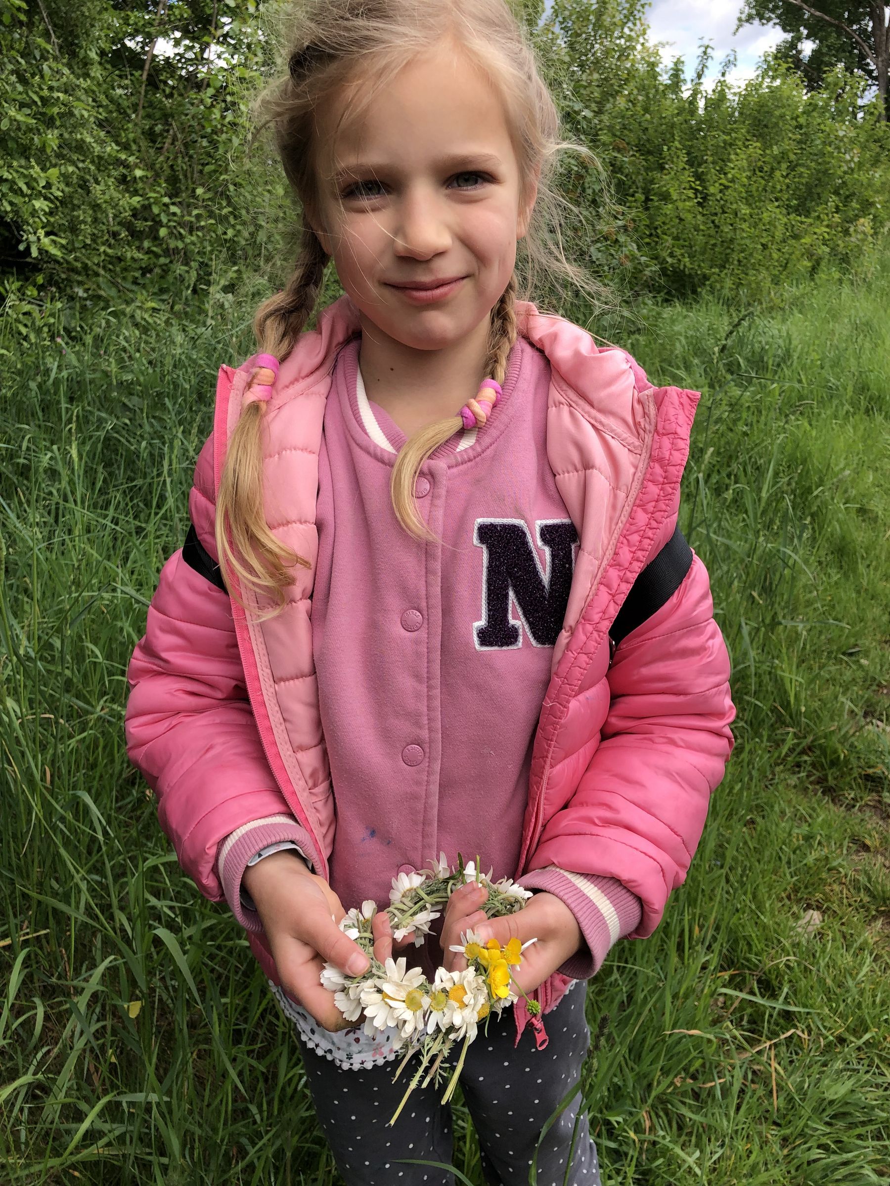 Auf dem Heimweg finden wir viele Blümchen am Wegrand, auch einen riesigen Löwenzahnstängel. Aus den Margariten flechten wir einen Haarkranz.