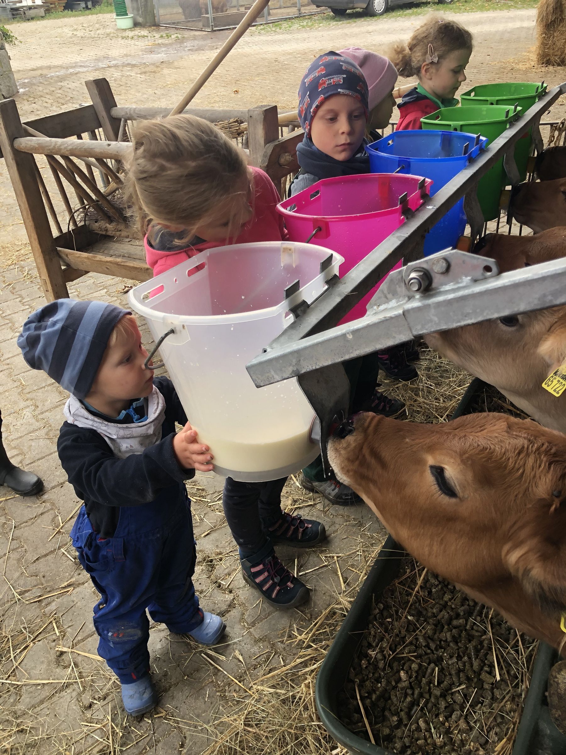 Auf dem Archehof gibt es außer den Kühen noch viele andere Tiere, z.B. Katzen, Hühner, Schweine und Kälbchen. Die Kälbchen dürfen wir sogar selber tränken. Das freut uns ganz besonders und macht viel Spaß!