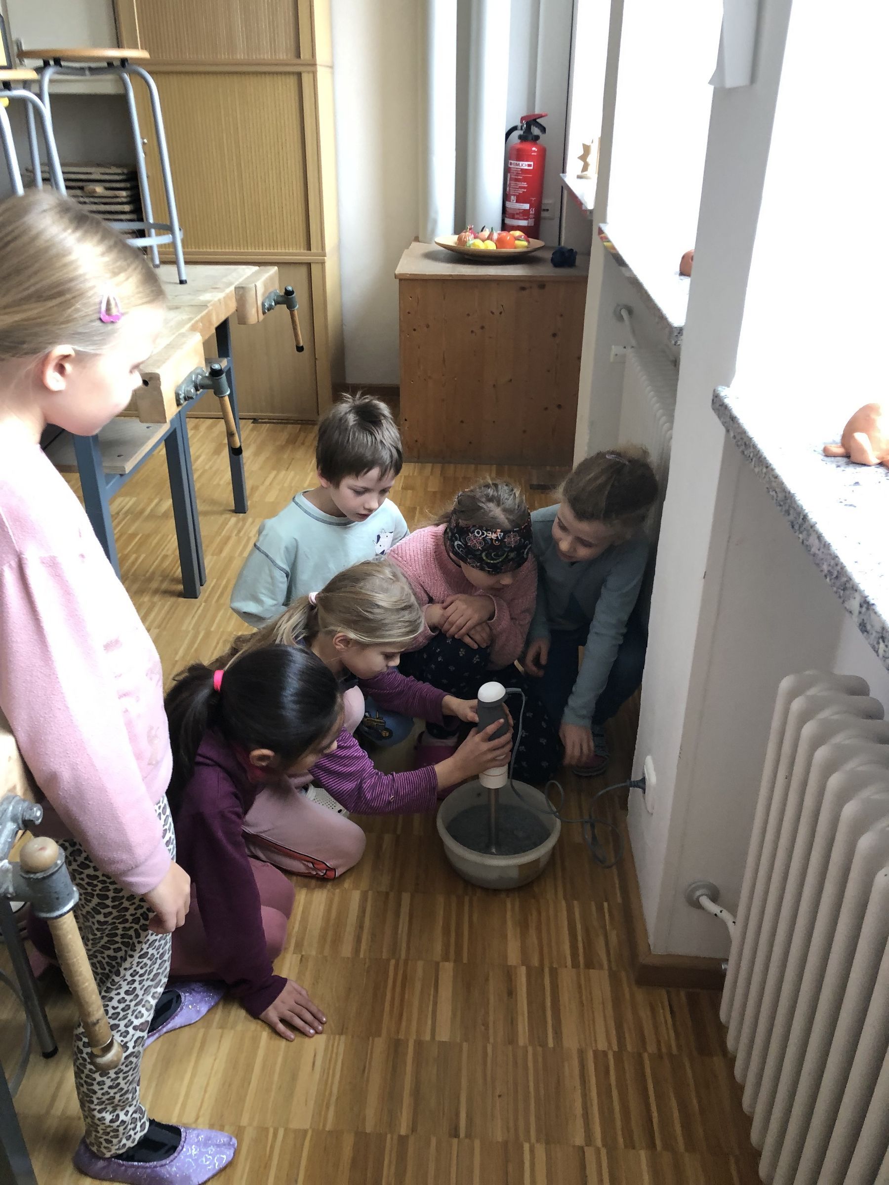 Diese Schnipsel weichen wir dann in einer Schüssel mit Wasser ein. Einige von uns haben riesigen Spaß, daraus mit dem Mixstab ein Mus, das man "Pulp" nennt, zu machen. "Iiiiiii" kreischen manche, wenn sie einen Spritzer davon ins Gesicht bekommen.