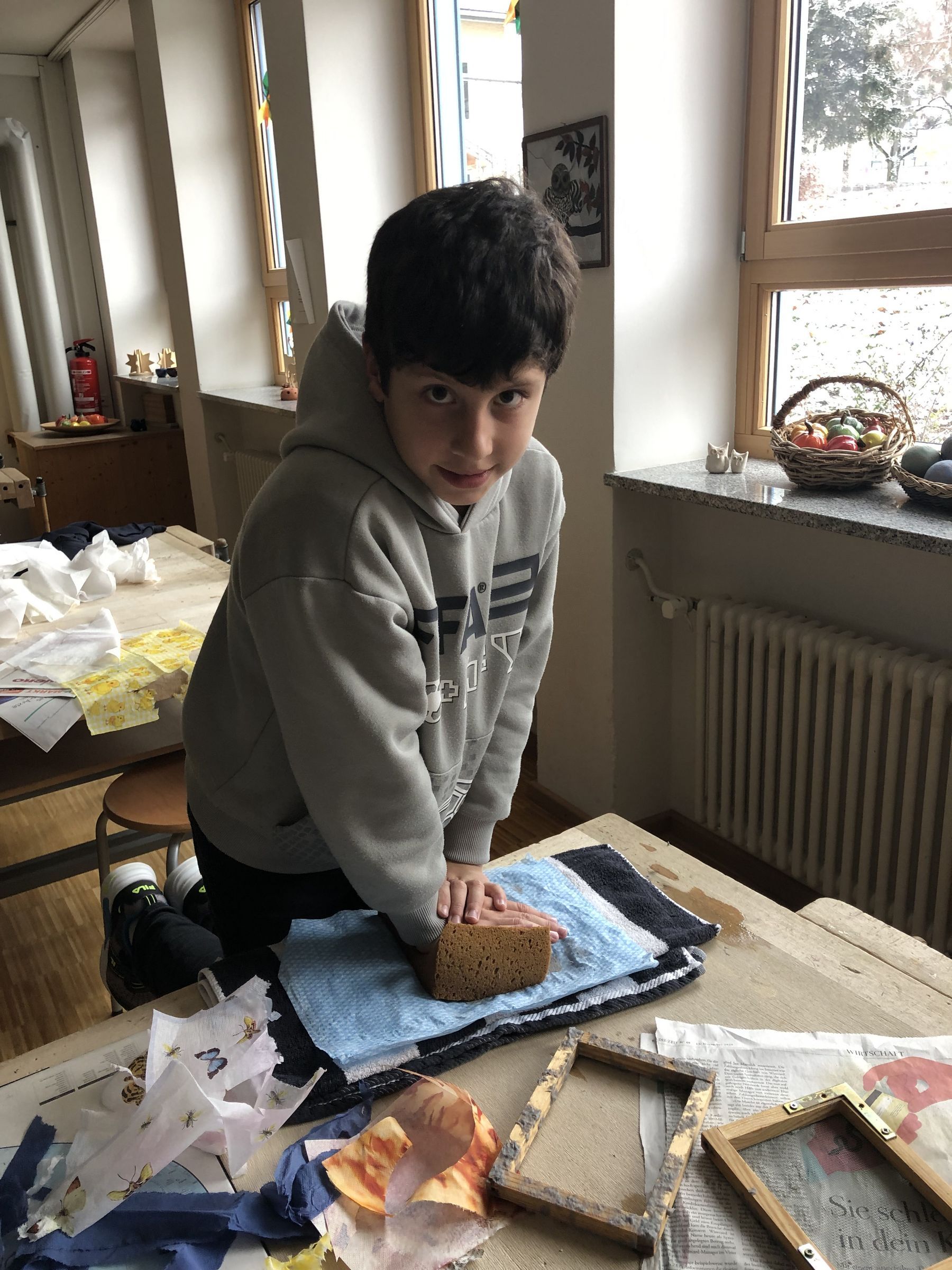 Im Werkraum der Schule legen wir unsere mitgebrachten alten Zeitungen, alte Handtücher, sowie bunte Servietten mit schönen Motiven an unseren Arbeitsplatz.