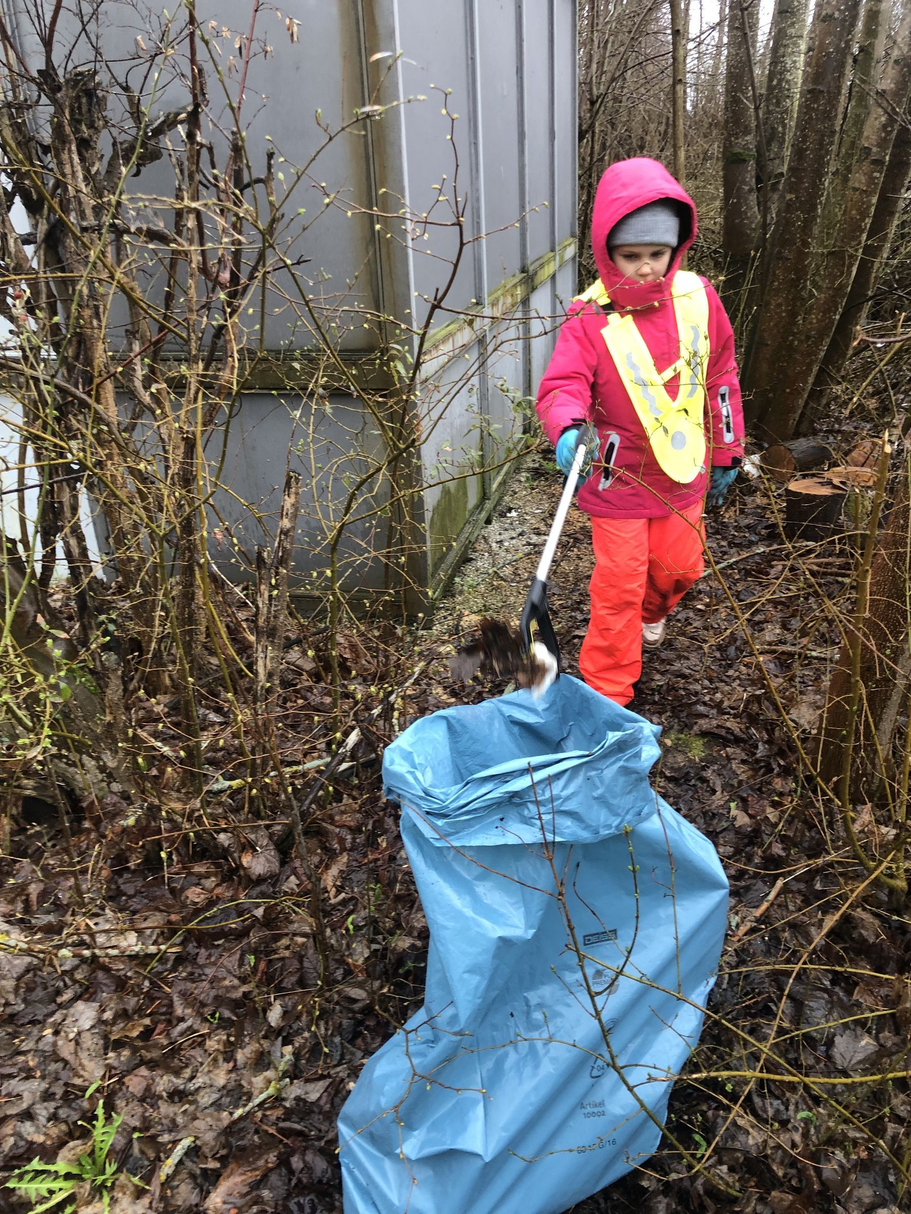 Trotzdem treffen sich 50 Teilnehmer im Schulpausenhof. Dort werden die Müllsäcke ausgeteilt. Da fast alle Kinder der "Eichhörnchen" ihre Eltern mitgebracht haben, können wir unsere in einige Gruppen aufteilen.