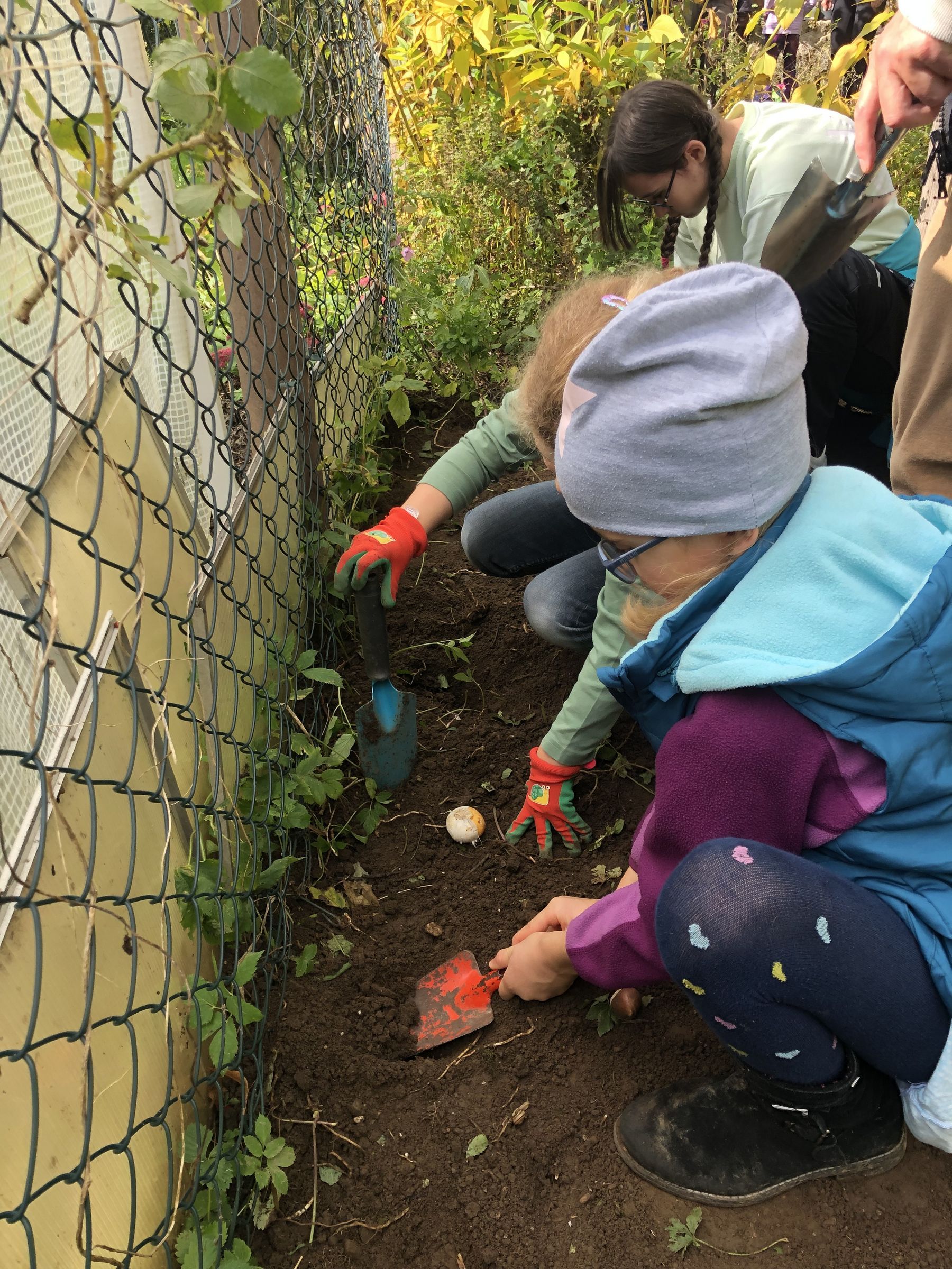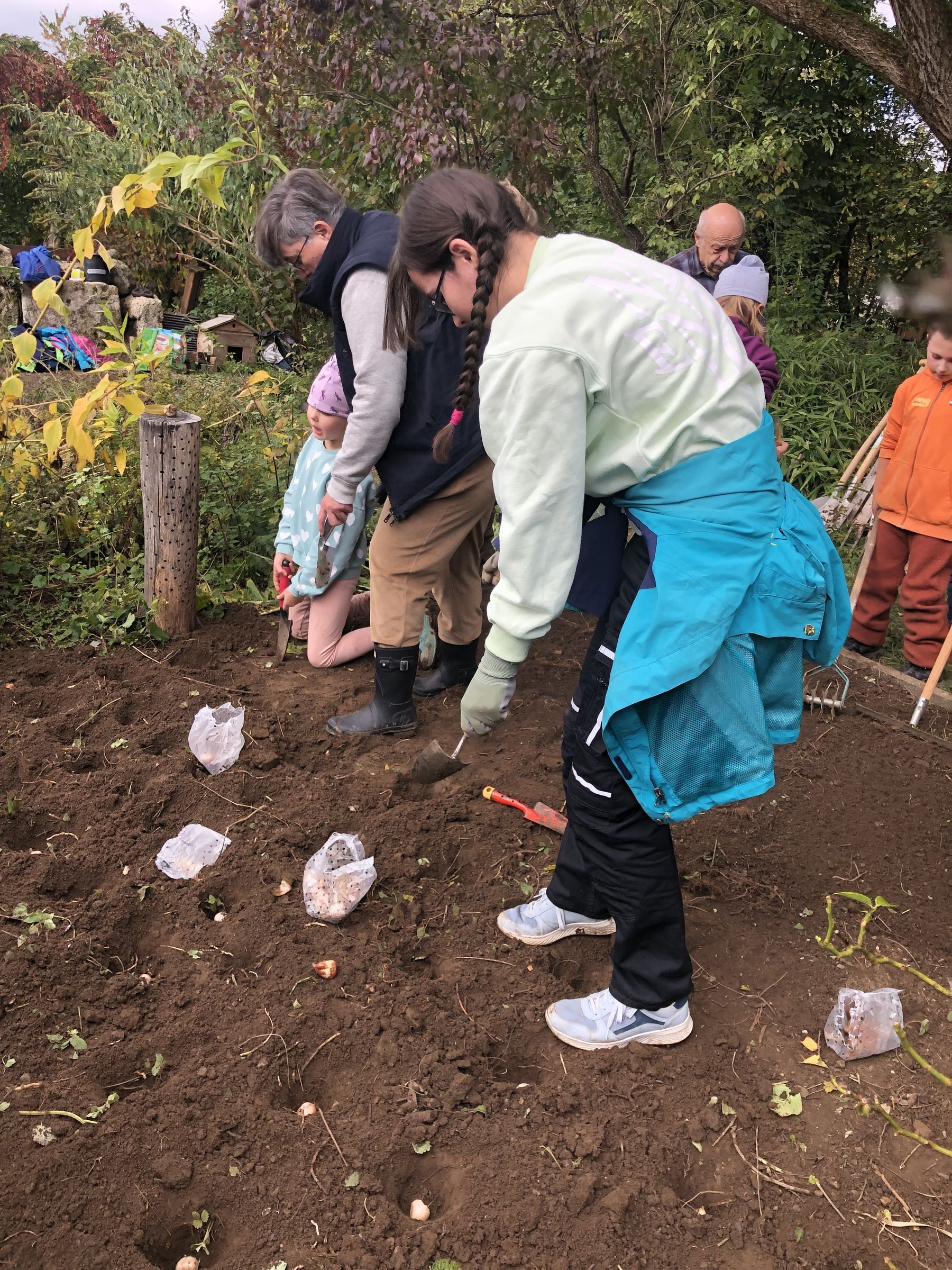 Nun geht es aber an die Arbeit. Wir verteilen die Zwiebeln kunterbunt im Beet.