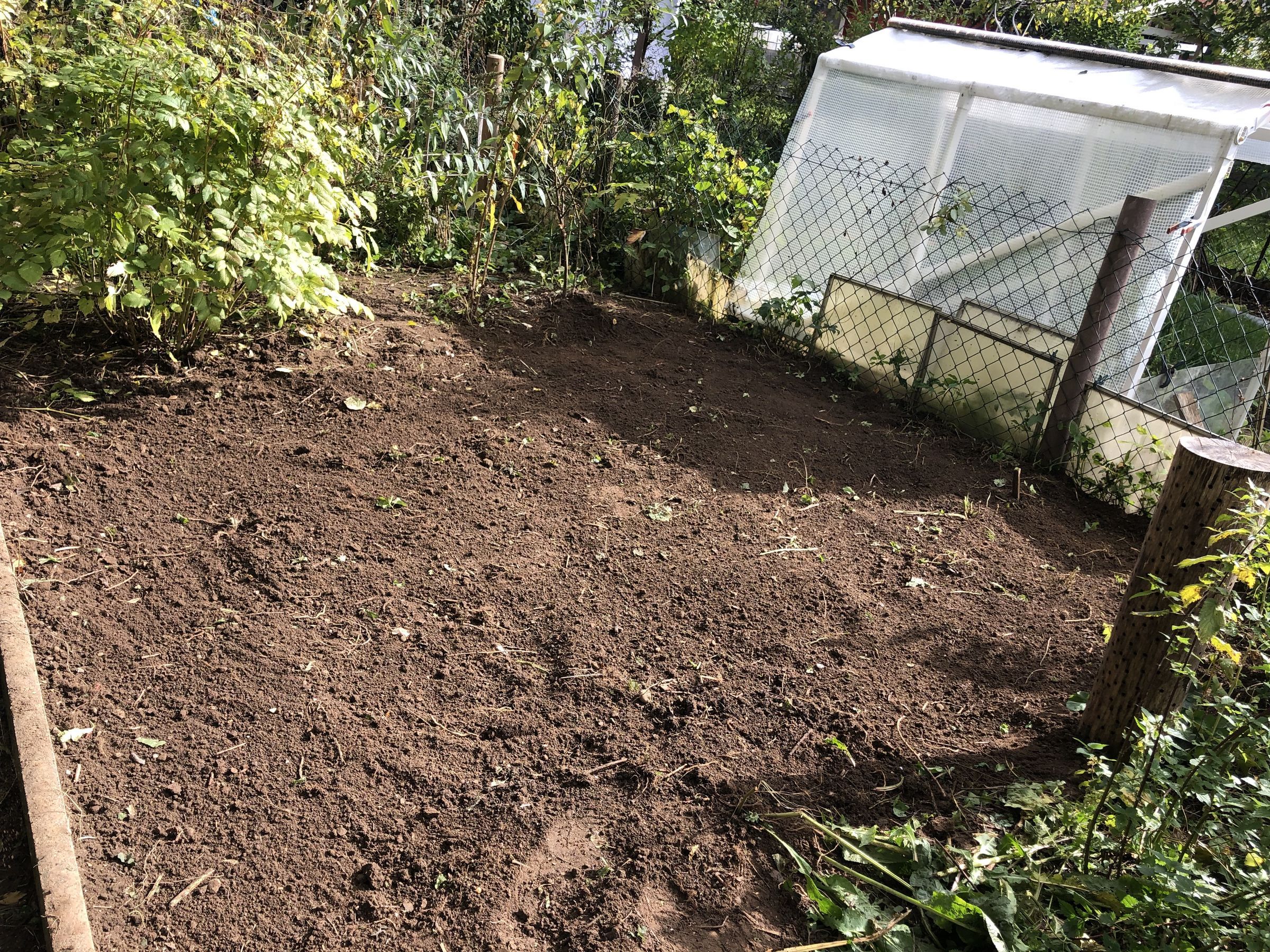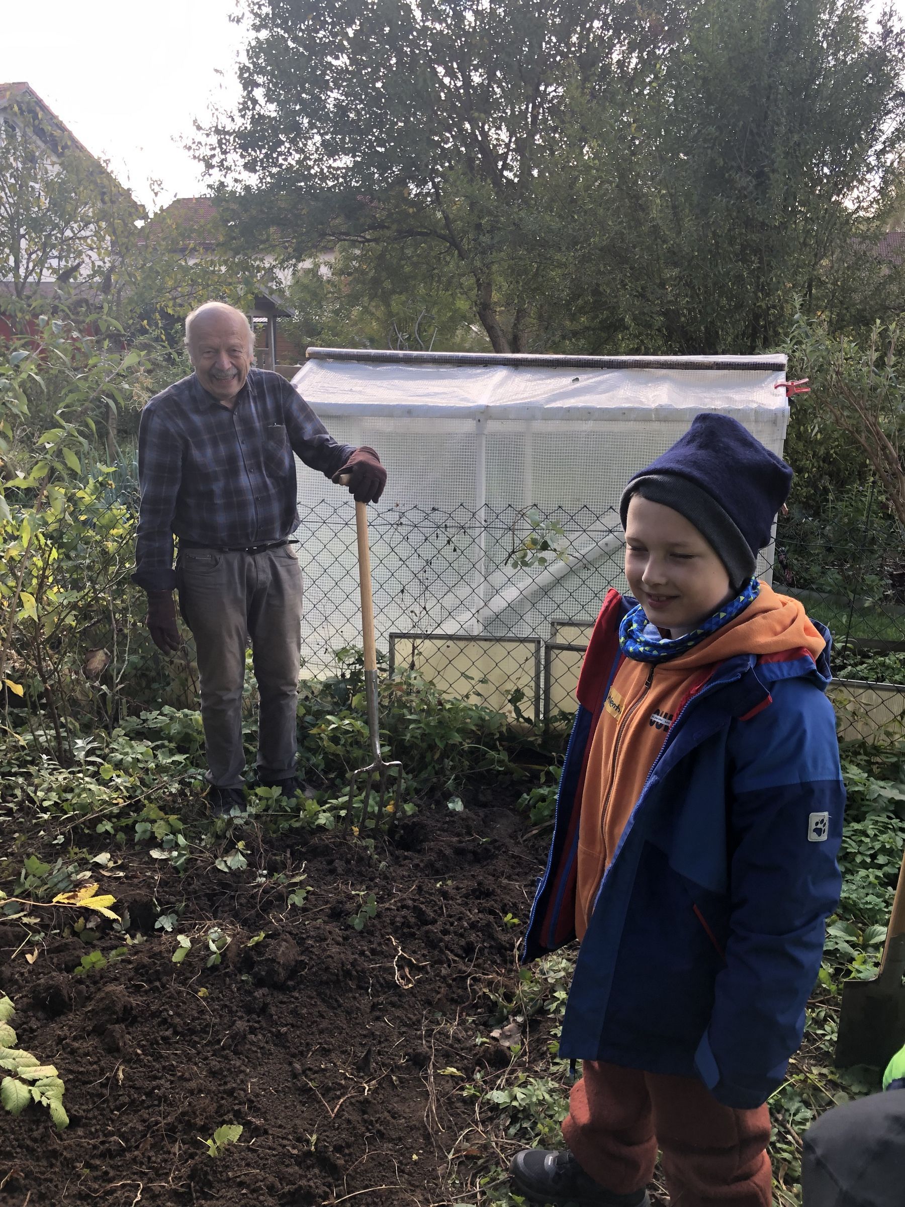 Jetzt geht es aber an die Arbeit. Roland ist extra gekommen, um uns zu helfen. Das Beet muss erst umgegraben und von Gras und Wildkräutern befreit werden, das wir dann im angrenzenden Wertstoffhof gleich entsorgen. Das ist anstrengend.