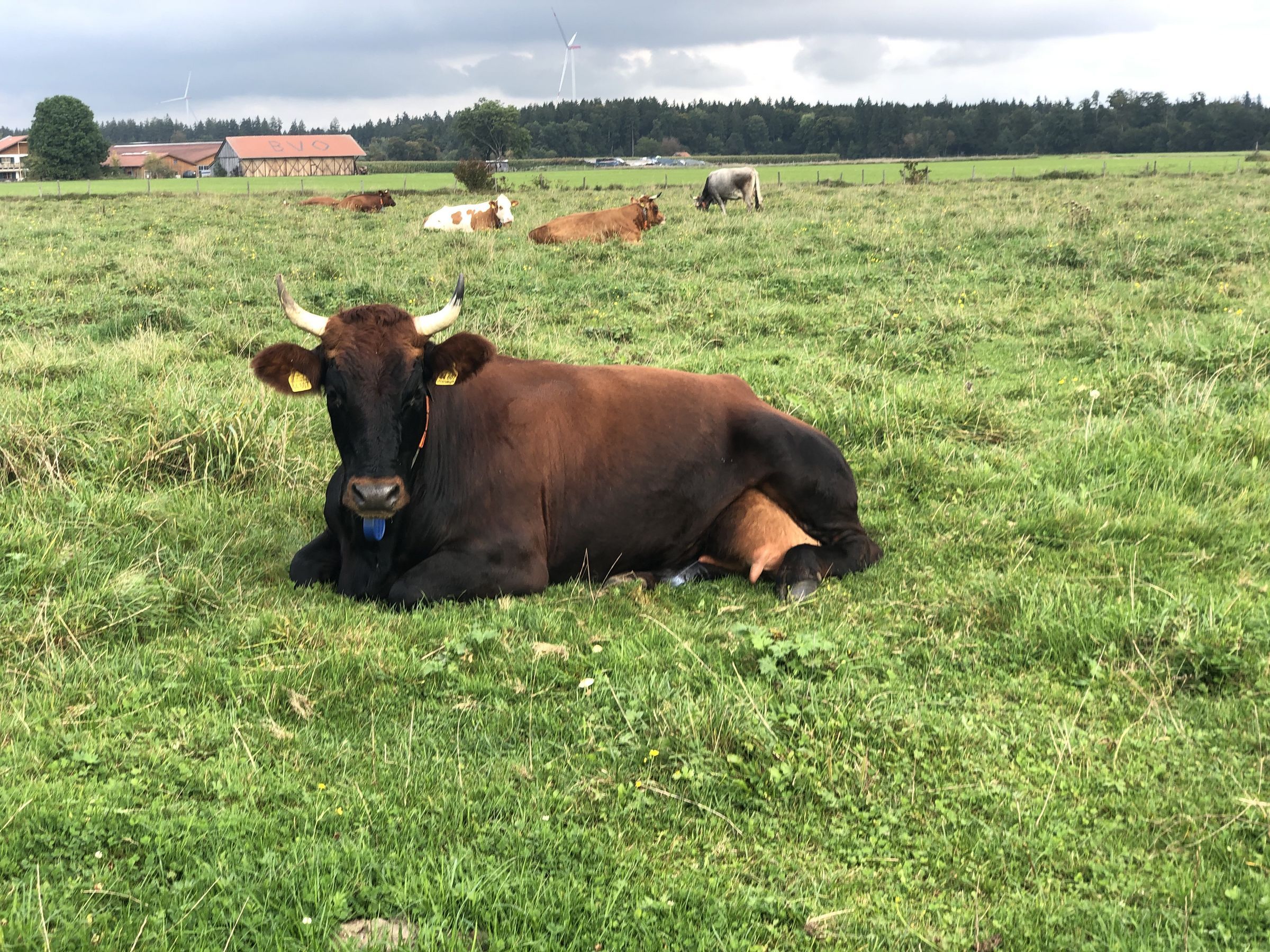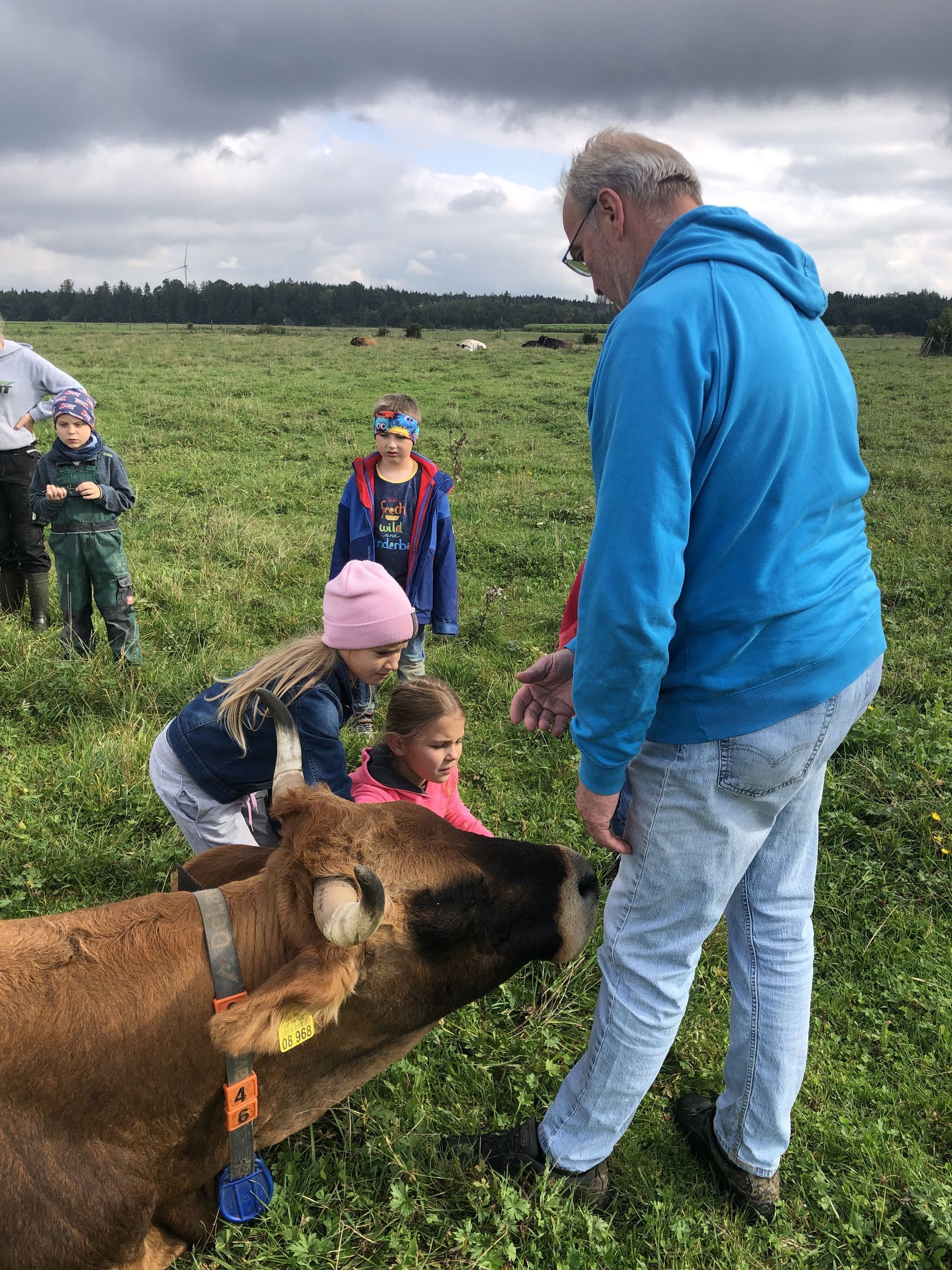 Nachdem wir gelernt haben, wie wir uns den Kühen auf der Weide nähern und wie wir uns ihnen gegenüber verhalten sollen, dürfen wir sie dort besuchen. Solche „Schönheiten“ gibt es zu sehen! Sogar kraulen dürfen wir sie.