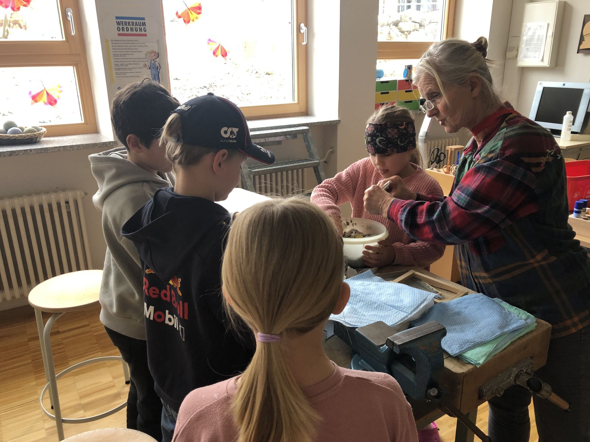 Diesmal hätten wir vor lauter Eifer unsere gemeinsame Brotzeit fast vergessen! Die holen wir aber nach, nachdem wir den Werkraum der Schule wieder aufgeräumt und gesäubert haben.