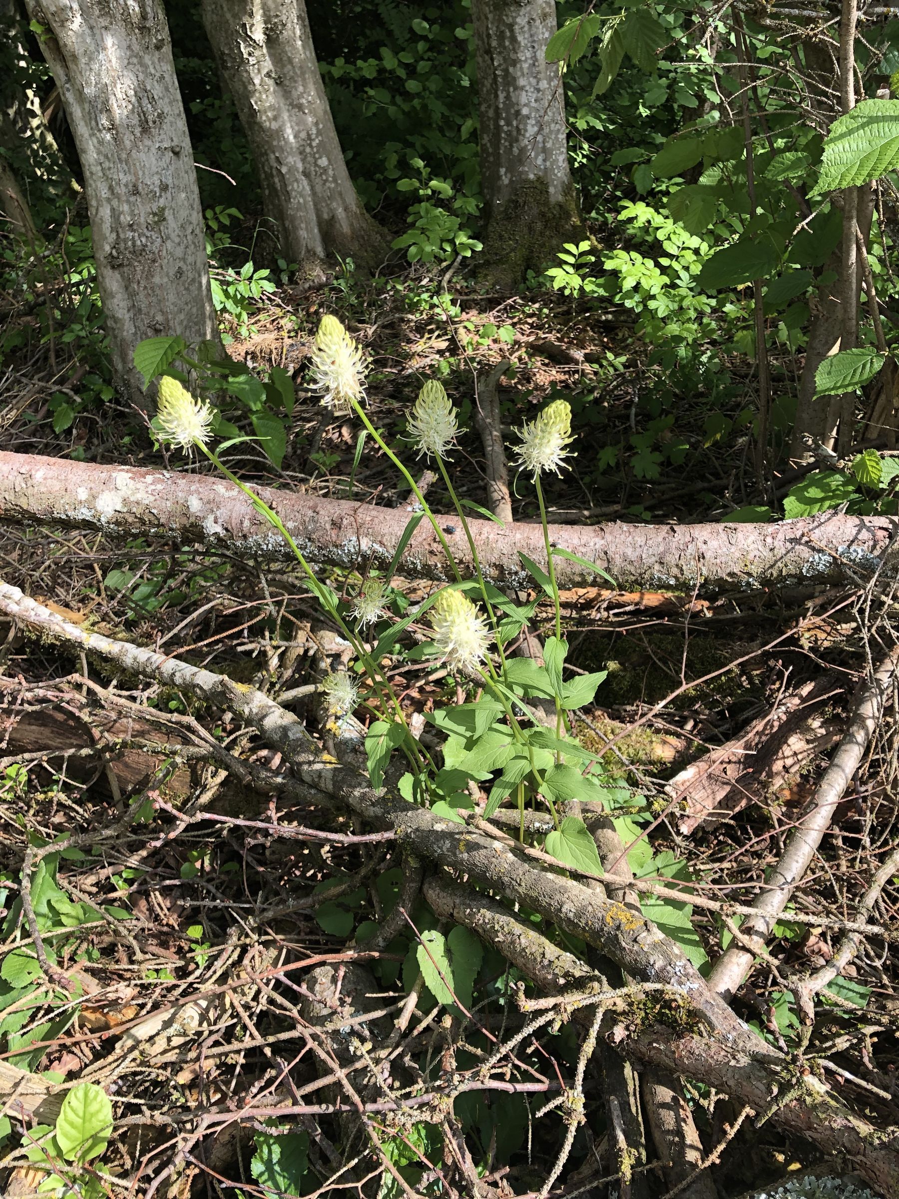 Der Rückweg ist ein Abenteuer. Wir müssen umgefallene Bäume überklettern. Aber wir entdecken auch schöne Blumen und sogar ein Tierskelett.