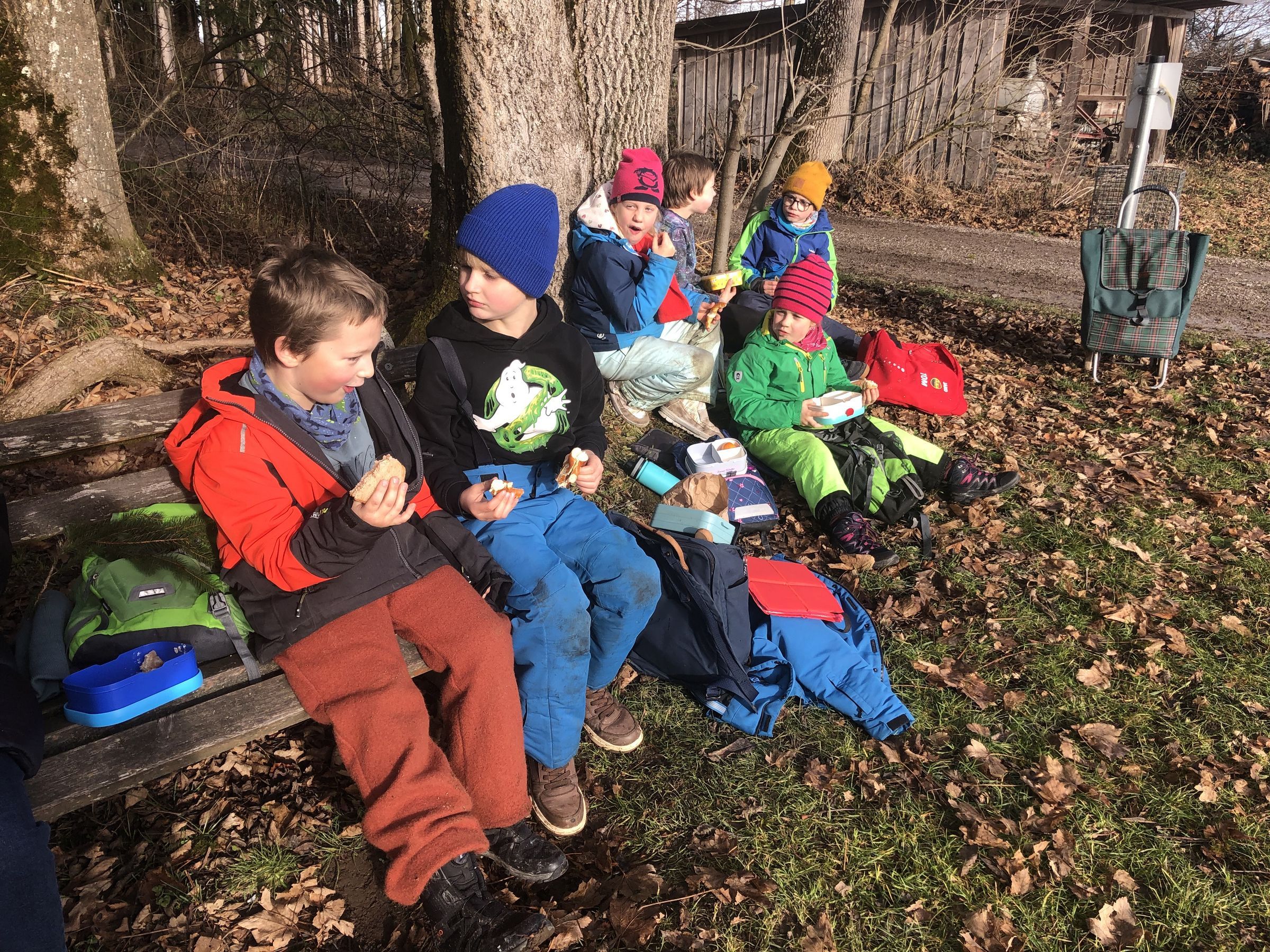 Im Anschluss an diese Arbeit suchen wir am Waldrand ein sonniges Plätzchen und lassen uns unsere Brotzeit und heißen Tee schmecken.