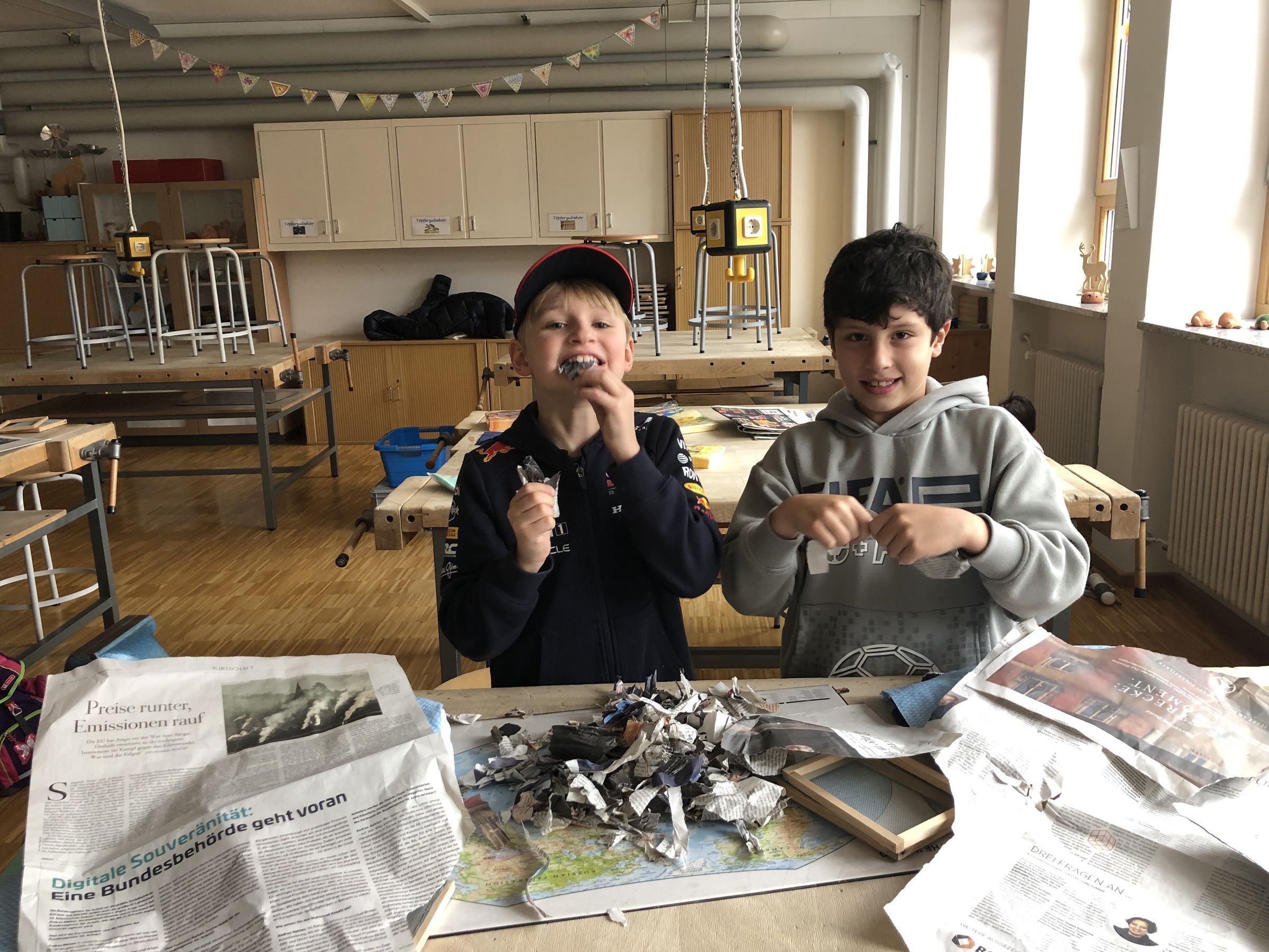 Wir machen uns sofort an die Arbeit! Unsere alten mitgebrachten Zeitungen sind schnell zerrissen.