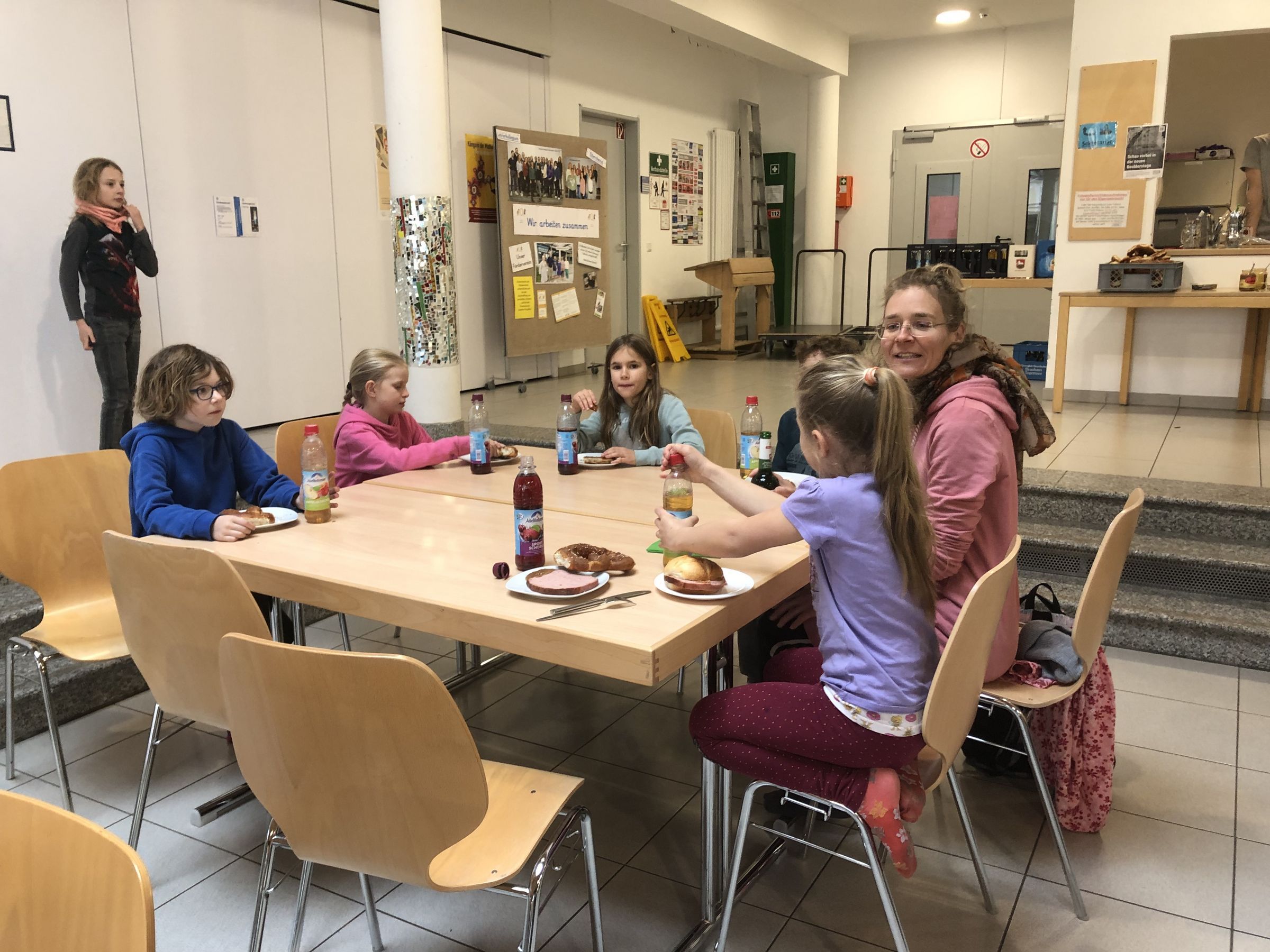 Zur Abschlussbrotzeit in der Aula der Schule, die die Gemeinde allen fleißigen Sammlern spendiert, treffen wir uns wieder.