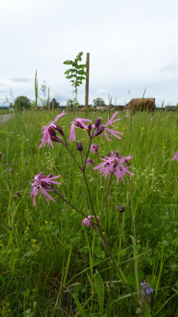 Der Wiesenstreifen hat sich ganz ohne unser Eingreifen gut entwickelt. Die Biologin Gaby Schneider, Mitglied im Vorstand der Kreisgruppe, fand (vorläufig) bereits 38 Arten. In intensiv genutztem Grünland hat man schon Schwierigkeiten 10-15 Arten zu finden.
