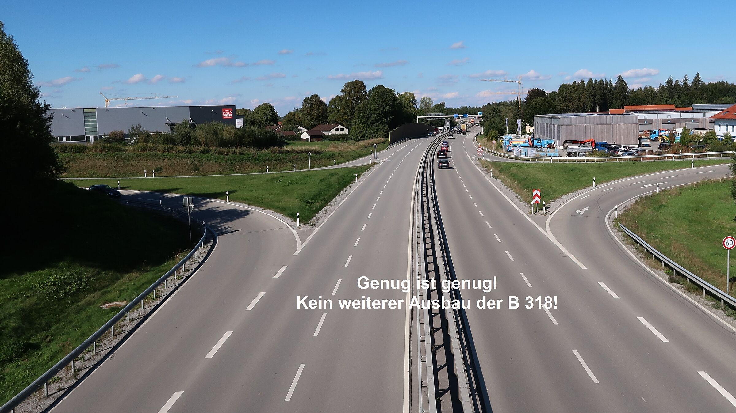 ... ist der Hinweis darauf, dass mit einem Ja zur blauen Trasse der vierspurige Ausbau der B 318 bis zum Anschluß an die Südumgehung verbunden ist - einschließlich Mittelplanke und abgrenzenden Zaun auf beiden Seiten. Hier gibt es weder einen Hinweis auf den Plakaten der Gemeinde, noch im Oktober-Gemeindeblatt.