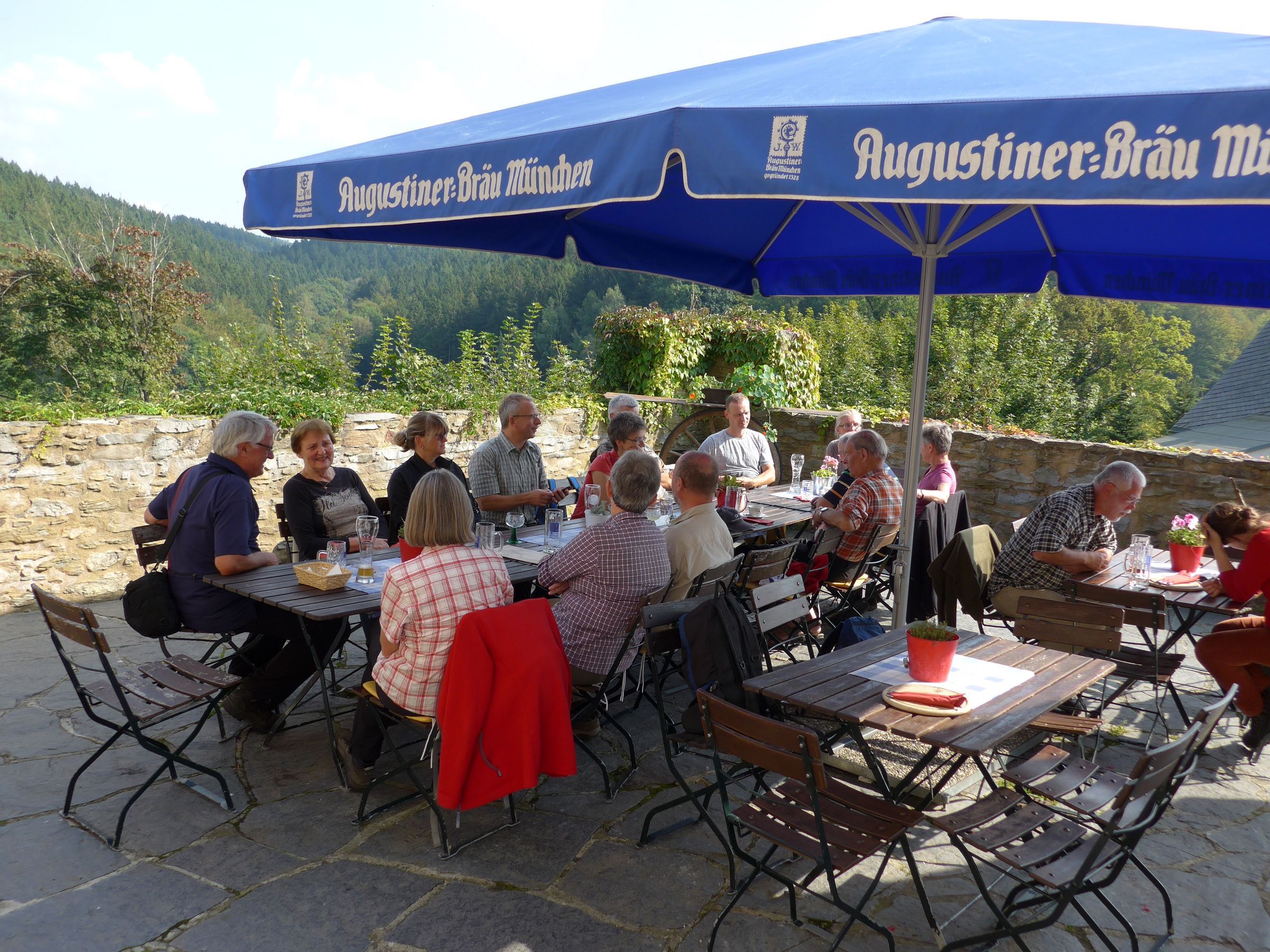 Sie wurde um 1250 im Zuge der Besiedlung des Erzgebirges von den Herren von Waldenburg erbaut, nachdem dort Silbererze entdeckt wurden. Nach einer sehr wechselvollen Geschichte, vor allem im 20.Jahrhundert, ist sie heute im Besitz der Sächsischen Schlösserverwaltung und beherbergt ein Weihnachts- und Spielzeugmuseum, Schauwerkstätten und eine gemütliche Burgschenke. Auf der sonnigen Aussichtsterrasse waren zu unserer großen Überraschung blaue Sonnenschirme aufgespannt, mit der Aufschrift „Augustiner Bräu München“. Die Erklärung dafür fanden wir auch gleich an hervor gehobener Stelle in der Speisekarte.