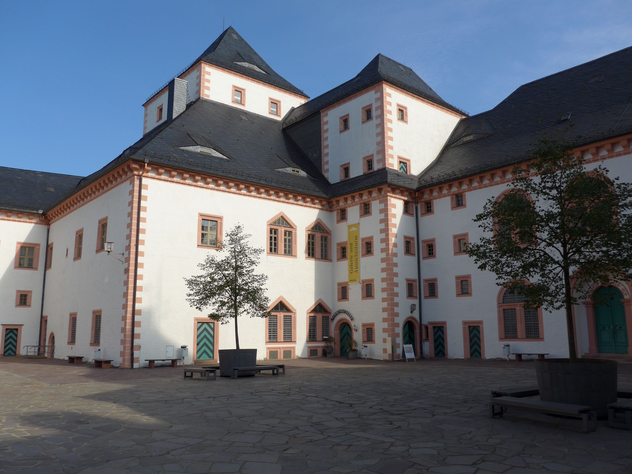 Der erste Abend stand ganz im Zeichen des Wiedersehens und einem umfangreichen Erfahrungsaustausch. Am Freitag fuhren wir zunächst nach Erdmannsdorf und von dort mit der Standseilbahn auf den Schellenberg zur Stadt Augustusburg und dem gleichnamigen Jagdschloss. Der Schellenberg ist ein erloschener Vulkan und bietet einen weiten Blick über das Erzgebirge. Kurfürst August hat mit dem Bau seines Schlosses Augustusburg ein repräsentatives Domizil für seine Jagdausflüge geschaffen. Der Grundriss des Schlosses ist quadratisch, an dessen vier Ecken mächtige Gebäude stehen und mit Zwischengebäuden an den vier Seiten verbunden sind.